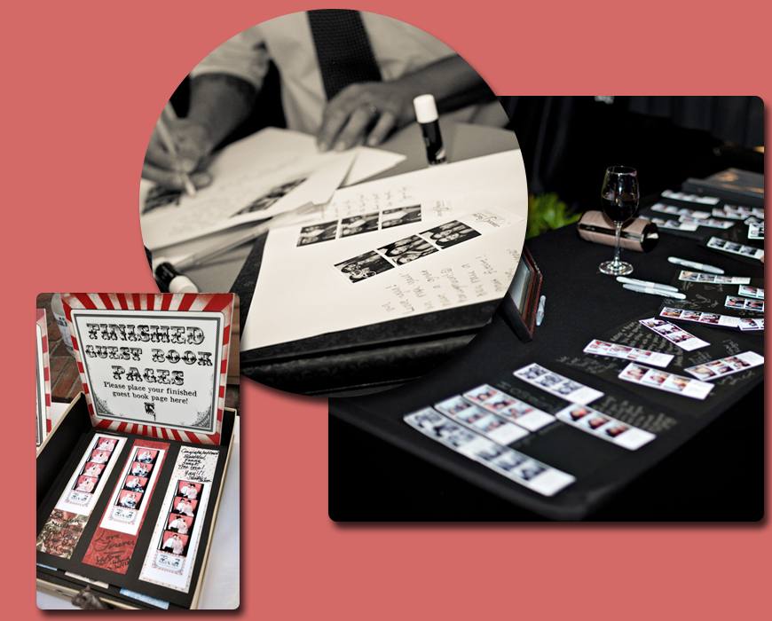Our guest book is a simple way to preserve the essence of your event. A Booth Host is dedicated specifically to assist and will see that one of the duplicate photo strips make it into the book with plenty of room for guest's personal messages. We supply all the pens and stationary to perform this.